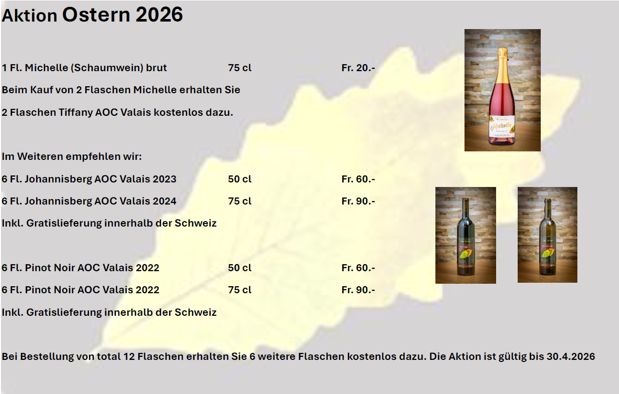 - Ein ganz besonderes Geschenk ist unsere „GnussTricka“ mit 1 Flasche Wein und Walliser Spezialitäten wie Trockenfleisch, Rohschinken oder luftgetrocknetem Speck und Hauswurst sowie unserem beliebten Walliser Roggenbrot.